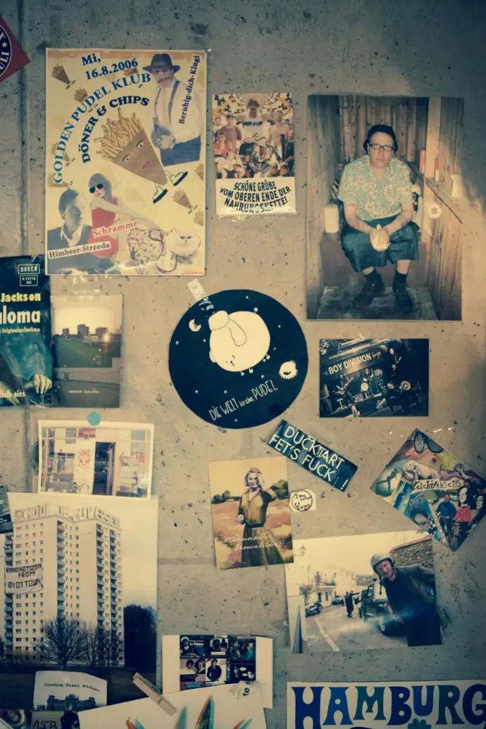 Und innen? Scheint das Ziel, die Waschbeton-Wände unter Kultur und Kunst verschwinden zu lassen, ziemlich gelungen. An der Klotür hängt der junge Udo Lindenberg mit dem „Alles okay!“-Daumen, den später Schumi zu Weltruhm dauerzeigen sollte. Ansonsten: Schallplatten soweit das Auge reicht. Aus Hamburg, von Labels aus Hamburg und auch welche, die Hamburger toll finden. Wir nehmen es genauer als ungenau.